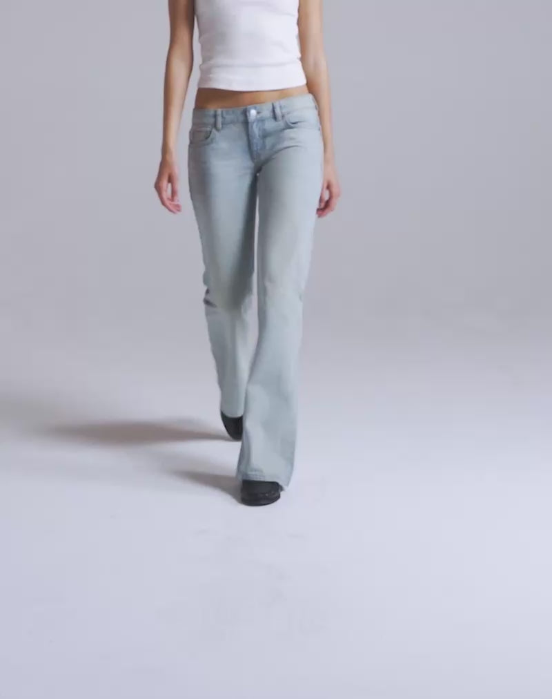 Dans un délavage bleu brise, notre jean taille extra basse présente une coupe évasée, une fermeture à glissière et à bouton, un ourlet propre, 5 poches et une patte arrière marquée, un bouton et des rivets. À porter avec notre Top à manches longues Dulcet.